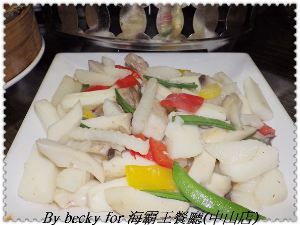 在這之後,終於出現了這一盤青菜類~山藥鮑菇,裡面有紅、黃椒、四季豆、山藥及鮑菇等,整個吃起來味道很清淡且好入口,而炒出來的顏色也鮮豔漂亮,山藥及四季豆都很鮮脆,讓同事欲罷不能。
