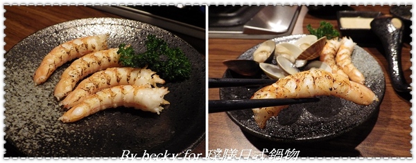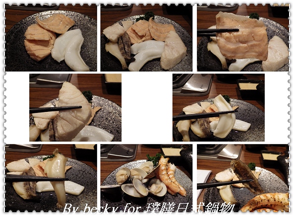 滿滿的海鮮佈滿盤子上,有鮭魚、花枝、石斑、蛤蜊、蝦子及鮑魚;拍完照後服務人員幫忙把食材放入鍋中煮,每樣食材都有控制時間,鮭魚及石斑就不用川燙太久,鮮嫰的魚肉在嘴裡彈跳,花枝的鮮脆更是高,吃在嘴中很有口感,蝦子川燙一下後拿到廚房烤,而且還幫忙剝殻,吃起來很有汁,鮑魚更是Q嫰,口感很滑順,沾著和風醬,金桔酸香味,將海鮮的味道發揮的淋漓盡致,帶出更是自然的風味。