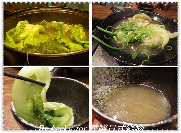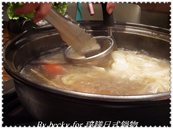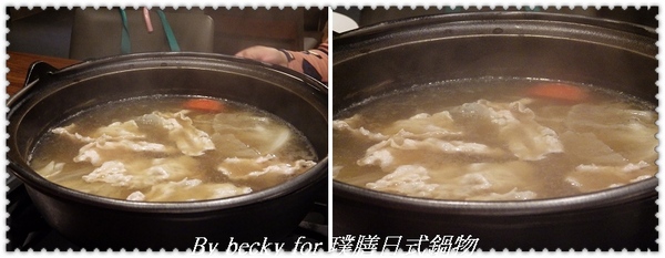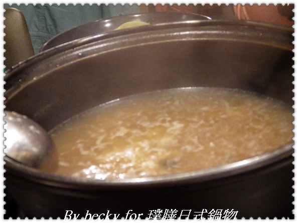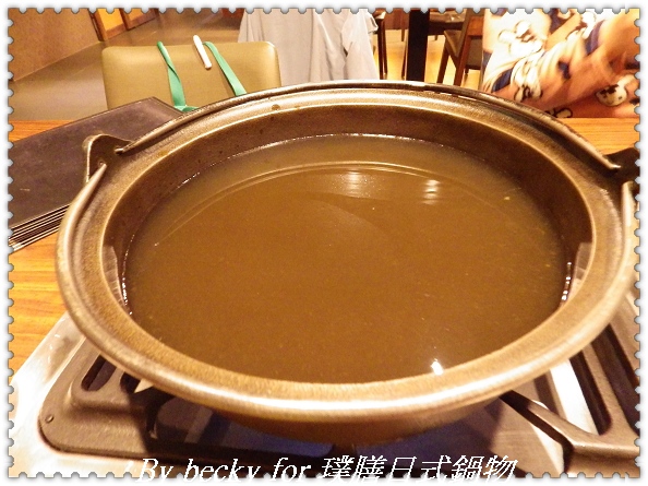 而在每個桌上都有鐵鍋,店家是用日本進口鑄鐵鍋,鍋子是一體成型,傳導熱性佳且也有保溫效果,服務人員在鐵鍋裡倒上湯頭;店家的湯頭是用蔬菜及柴魚昆布細火慢熬煮,沒有加任何味精柴魚粉,可以品嚐到真正的日式風味。