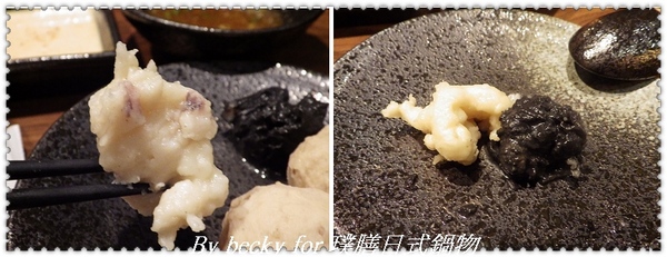 凍豆腐吸飽了湯頭,咬下後湯汁四溢,裡頭很紮實,凍豆腐的豆味十分濃厚;手工丸更是令人驚喜,裡面包著泡菜及芋頭,第一次吃到跟市面上不一樣的丸子,泡菜丸子吃在嘴中略帶鹹味,因丸子吸滿了湯汁,味道十分融合;芋頭丸子的口感略淡,芋頭很鬆軟,跟著丸子沾著醬料一起食用,口感很Q。