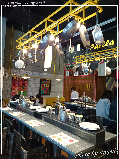 靠牆的兩旁是一般的座位區 中間則是高腳座位區 高腳區的天花板 還有燉飯鍋盤的擺設 真有趣!