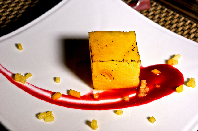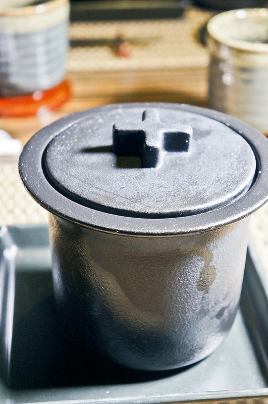 山藥豆腐上襯了一蕨類山菜,豆腐略帶軔性,但山藥味與底下的柚子醋搭配很好,吃的時候建議可以先單吃一口豆腐,第二口再去沾醬,會感受到不同的口感
