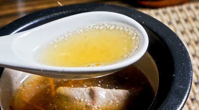 湯頭採用金華火腿與老母雞的中式湯頭,搭配很特別的九尾草