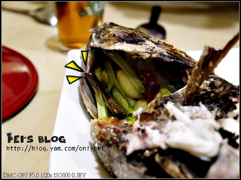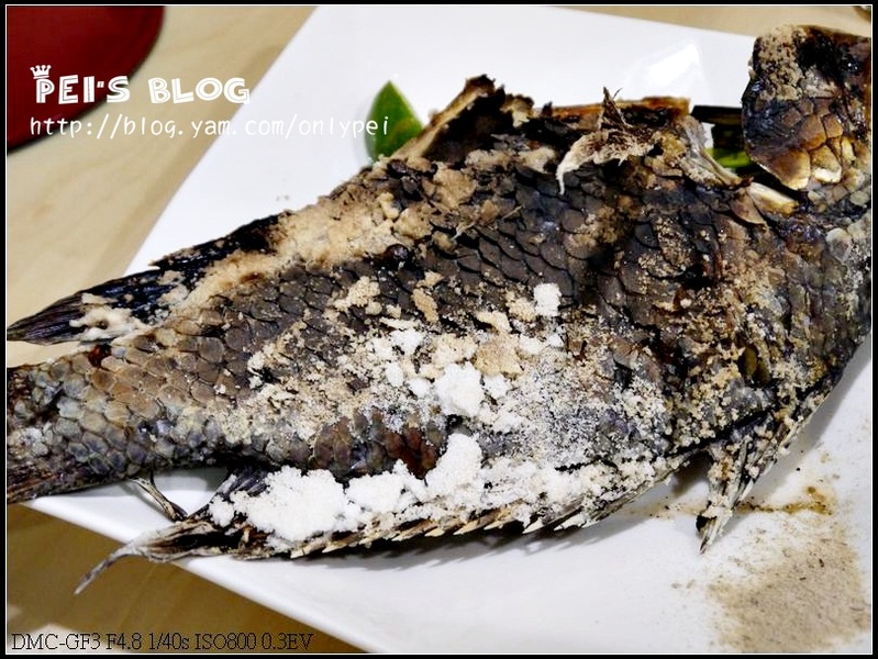 海鹽烤鮮魚(380元) 一整尾新鮮的台灣鯛包上海鹽後,連鱗帶皮一起鹽烤~