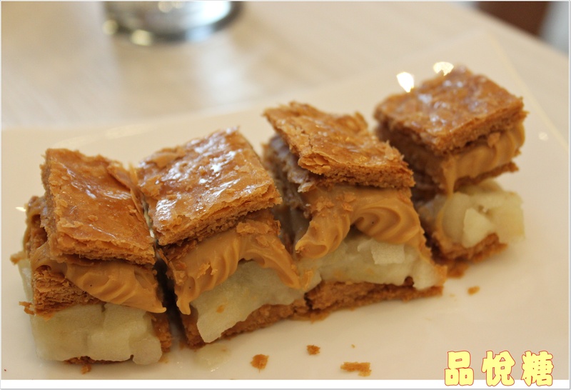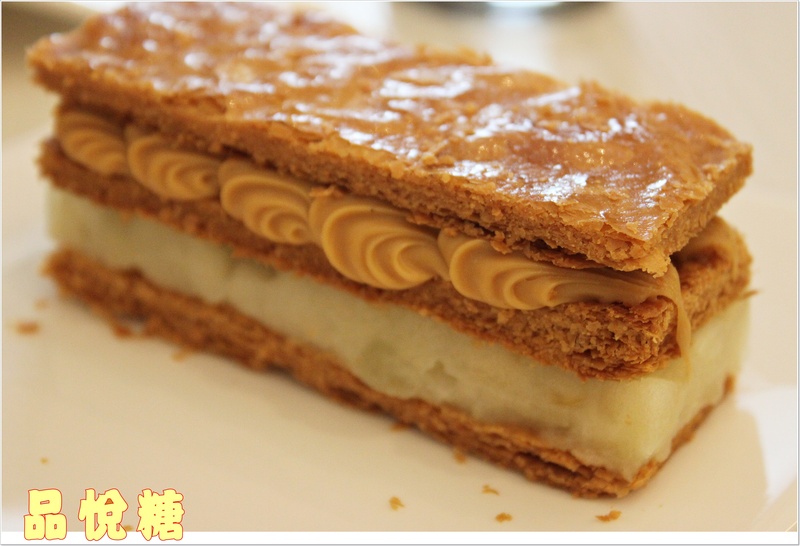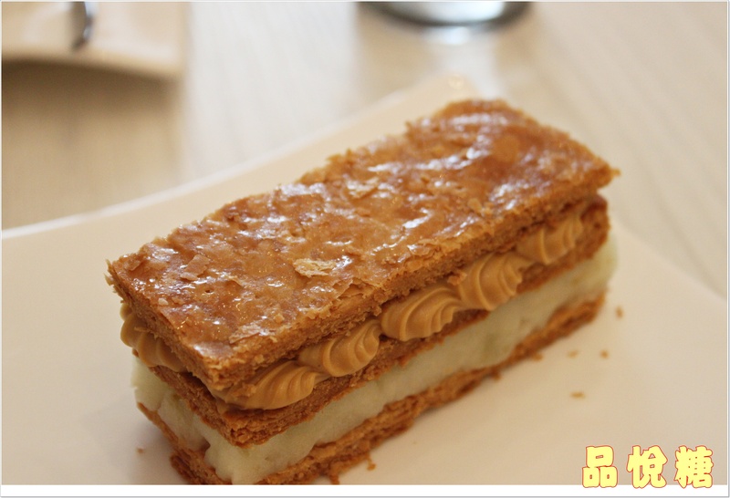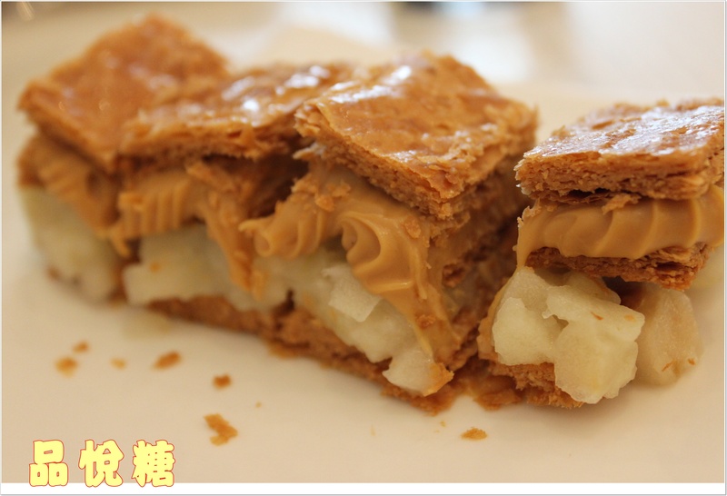 酥香完美的千層派皮 接著是香甜焦糖泥 最下面則來上青蘋果泥做搭配
