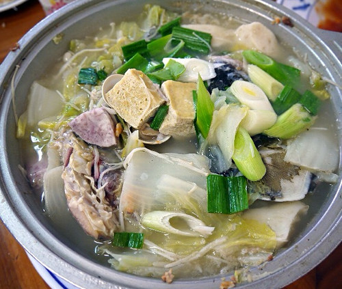 砂鍋裡有魚頭 芋頭 豆腐 川丸子 蛤仔 金針菇 大白菜 蒜苗等