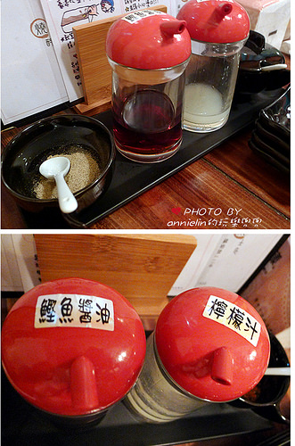 桌上還放了一些酌料(鰹魚醬油,檸檬汁,七味粉,胡椒粉)