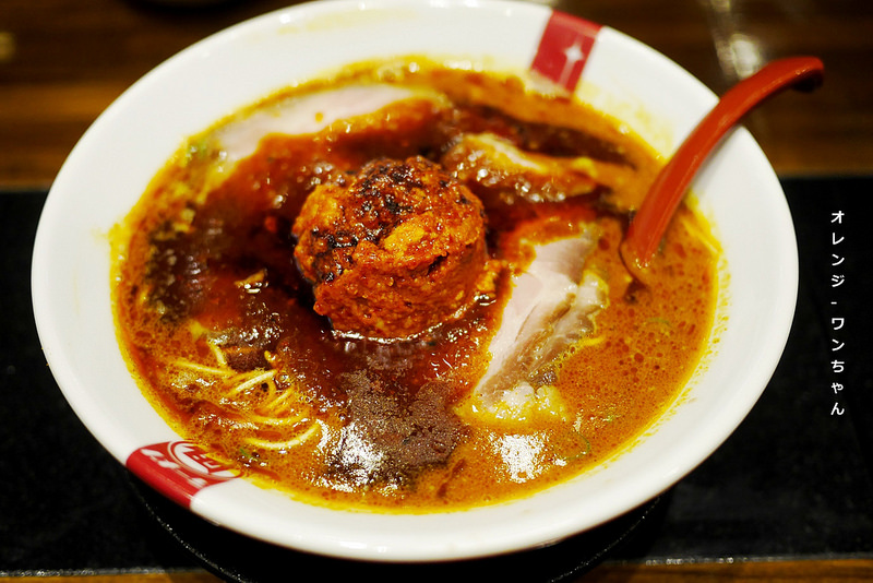 用豚骨湯頭為底..加進大蒜、辣油、唐辛子..然後加上中間豬絞肉與辣味噌製成的赤王球..