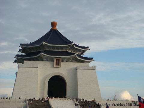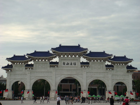 高達三十公尺的牌樓氣勢十足,以寶藍色琉璃瓦為頂,搭配白色柱身,與紀念堂相輝映。