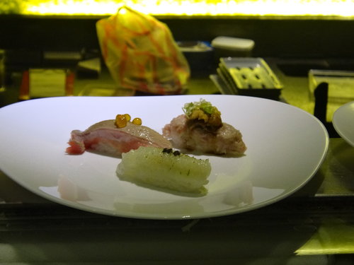 這是1500套餐中ㄉ握壽司~~~剛好進來ㄌ三個日本客人,主廚準備好要上菜時搶拍ㄉ