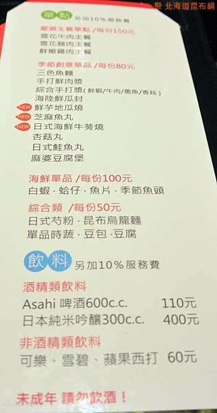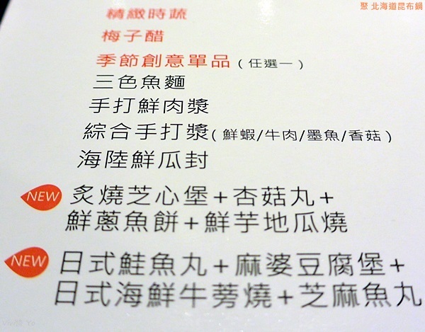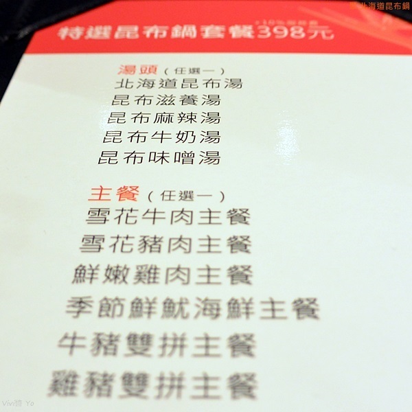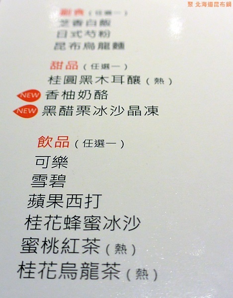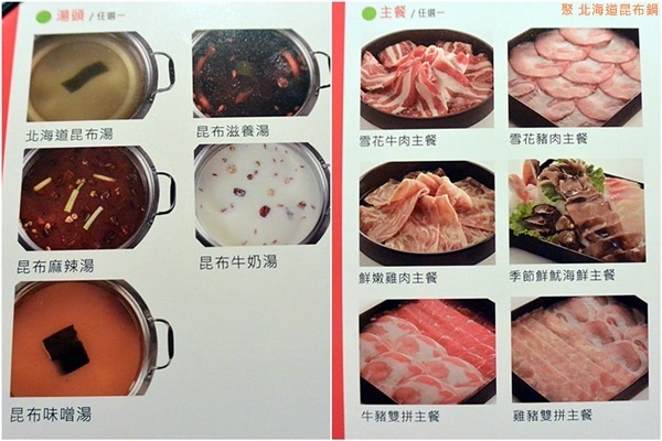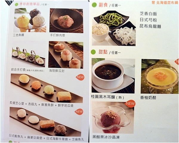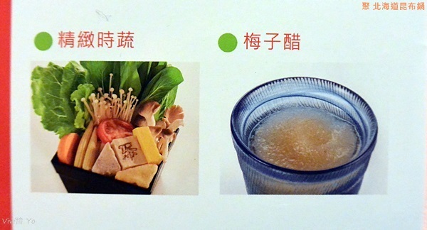 SOGO店只有提供「特選昆布鍋套餐」,餐點可以挑選: 湯頭、主餐、季節創意單品、副食、甜品與飲料,還有提供精緻時蔬、梅子醋。