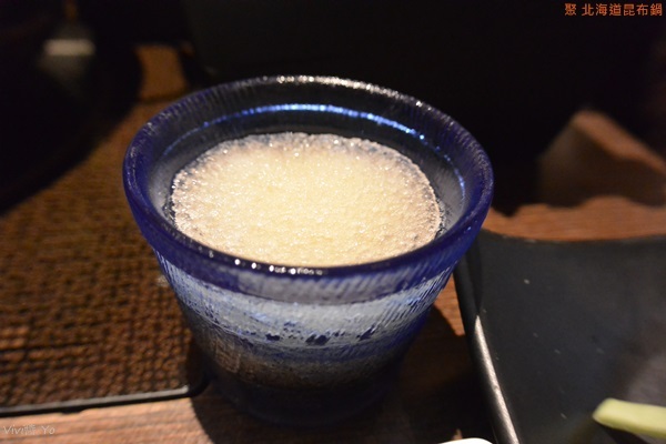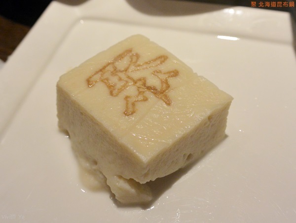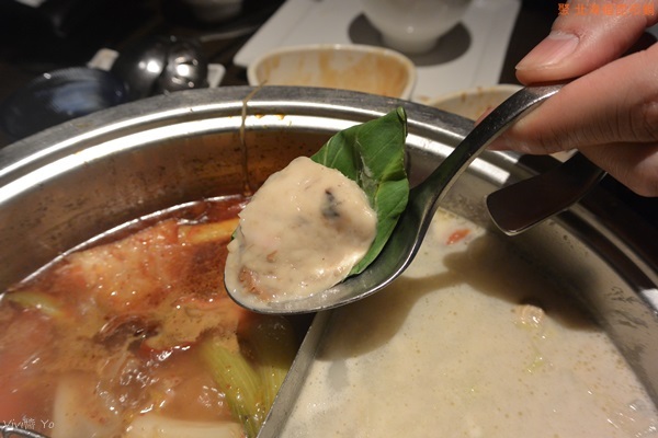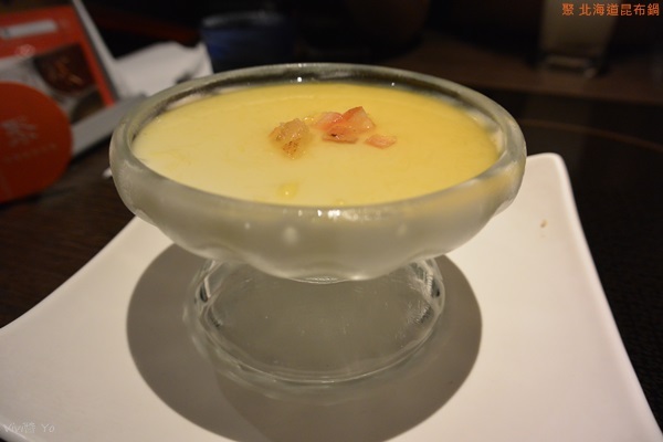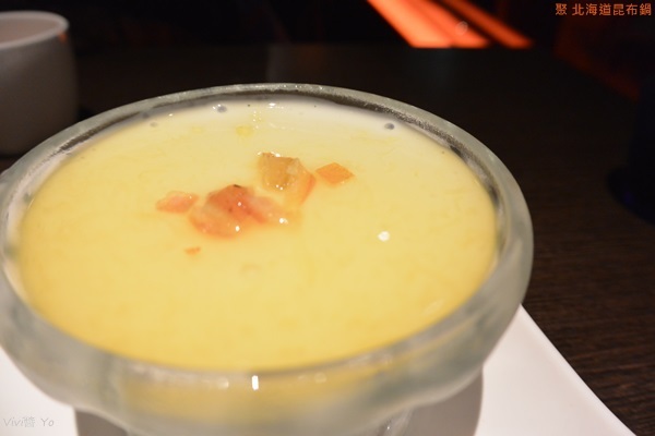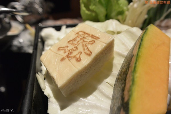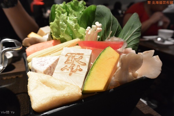 有大量的蔬菜堆得跟山一樣高,除了有三種青菜外,還有杏鮑菇、金針菇、芋頭、南瓜、番茄、胡蘿蔔、玉米筍、油豆腐、凍豆腐等,大量蔬果放入湯中熬煮,最後變得很鮮甜。最吸睛的莫過於那個印有”聚”的凍豆腐,他煮起來膨脹好大一個,吃起來是很細緻的那種口感,有點像是無老鍋的冰淇淋豆腐那種。
