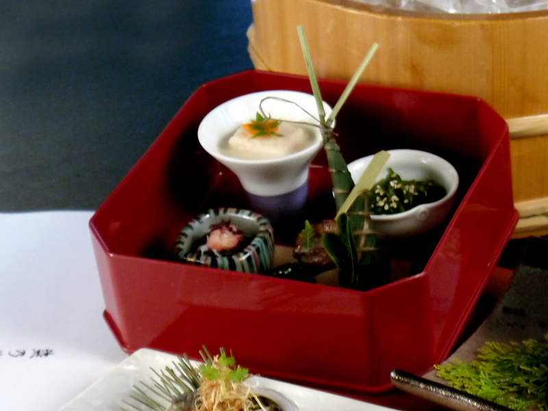 首先讓我驚喜的是一組前菜的擺盤,是用一個紅色器皿來擺盤,看起來相當高貴細緻,食用時把原先覆蓋在食物上呈現拱形的紙卡取下(好像在掀新娘頭紗說),就可以看到五道可口的菜餚映入眼簾。首先是「栗麩田樂」,有分甜鹹兩種口味,外表酥軟裡頭卻Q彈,口感我覺得有點類似麻糬,且外表因炙烤過帶有微微的焦香。它的沾醬為胡麻味噌醬,口味香濃帶有一些甜味,非常契合。而「水雲」是醃漬過的海菜,口感帶點脆度,吃來既爽口又開胃,且帶有些微的酸度,是充滿日式的開胃漬物。「鰹魚高湯菠菜」是把鮮嫩的菠菜加入清爽的鰹魚高湯,再以濃郁的海味提點菠菜的甜,灑上芝麻的菠菜入口後更多了一份獨特的香氣。「洋蔥豆漿蝦丸」入口時可同時嚐到蝦肉、洋蔥與豆漿三種食材各自的風味,蝦丸的口感雖類似豆腐,卻有著蝦肉的鮮甜和Q彈,醬汁則有濃郁的豆香味,相當具有層次。而「鰻魚日式粽」是將鰻魚和日式米飯結合,做成握壽司的形式,呈現出日本道地的日式粽風格,簡單卻又獨特。