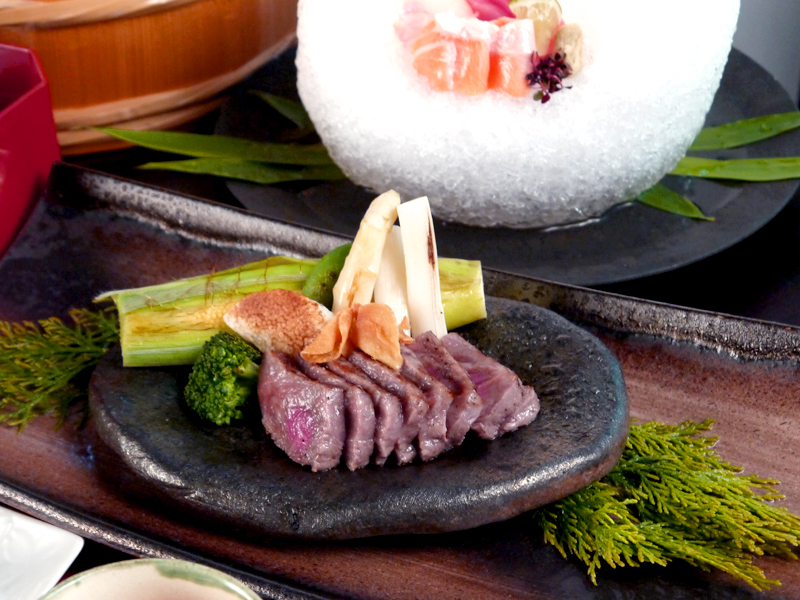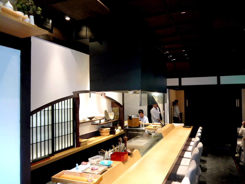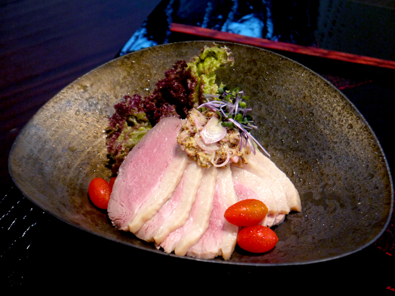 進入店內,坐在廚檯邊,便可就近欣賞日本師傅專注而細膩的烹調手法,不時還可聽見師傅以日語親切的問候,而且更有穿著粉色和服的服務生添加茶水,真的讓我自己覺得好像就在日本用餐般。我翻了一下菜單,先單點一份「酒斟鴨肉」品嚐,這道料理非常美味,是以日本清酒料理,類似料理醉雞的方式,並且揉合山葵、芝麻和洋蔥香氣的沾醬為整道料理畫龍點睛。當夾了一片粉嫩色的鴨肉送入口時,肉質肥瘦比例適中且不柴不澀,吃來順口具韌性,隨後而來的洋蔥香嗆感更是提升鴨肉的層次,跟朋友一起share剛剛好。