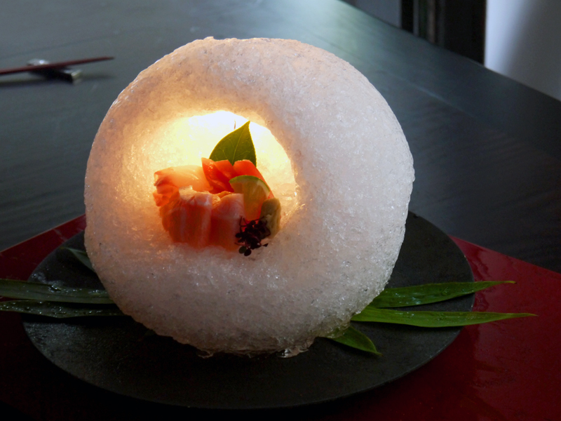 這次的「生魚片」一端出來,我不自覺就「啊~」了一聲,因為擺盤太令人驚豔了,師傅是把球形冰雕挖空後,再放置新鮮的生魚片,裡面還有一根小蠟燭在冒火燃燒,賣相超級吸睛。朋友跟我說,這可是因為他有事前預訂,才會有這樣的特別擺盤(真是感謝朋友的貼心)。而主角生魚片,夾起可看到油花均勻分布,鮮度自然不在話下,海味與鮮甜雙重感受一次滿足味蕾。
