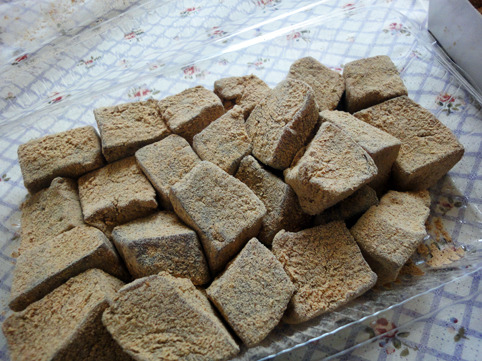 我不愛吃甜食類,不過這款黑糖麻糬切成小方塊,裹著黃豆粉+少許花生粉?