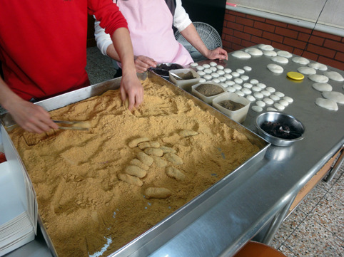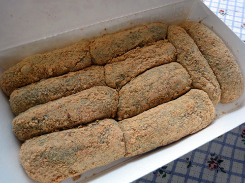紅豆泥與芝麻粉的綜合體,外面裹著不帶甜味的花生粉,