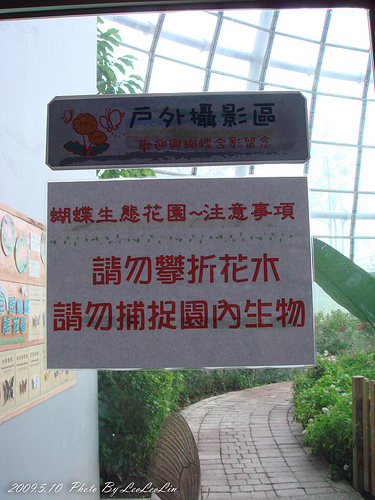 嘉大昆蟲館一樓的水生昆蟲展示區旁的玻璃門便可到蝴蝶溫室花園區。溫室內以台灣中低海拔原始林相為棲地造景,展示台灣各類活體蝴蝶。並設置緩昇坡的參觀步道,引導遊客由一樓水生昆蟲展示區至二樓昆蟲資源產業區,途中配置瀑布、水景與觀景台。溫室蝴蝶花園區最重要的設計意向是在溫室內繁殖大量的蝴蝶在熟悉遊客後,進而與遊客產生互動。↑除了攝影請勿攀折花木與捕抓生物。↑環狀的賞蝶步道繼續閱讀→延伸閱讀:(生態之旅)池上。蠶桑休閒農場南投。台一生態教育農場嘉義。嘉大昆蟲館-生態之旅七股。黑面琵鷺保護區-賞鳥去