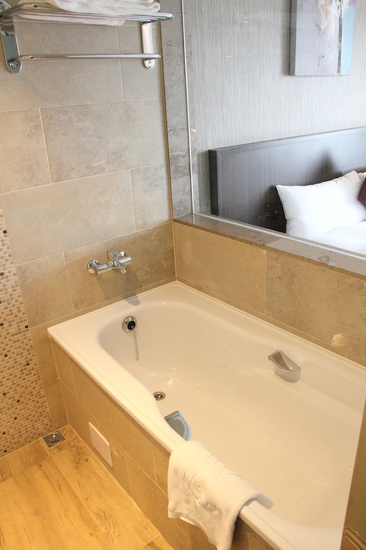 雖然雙人房的房間不算很大,不過配置得很舒適,除了一張大床之外,窗戶旁有一處小茶几沙發,附贈一份水果可以享用,而冰箱裡的飲品點心也都是免費的,不需額外付費。