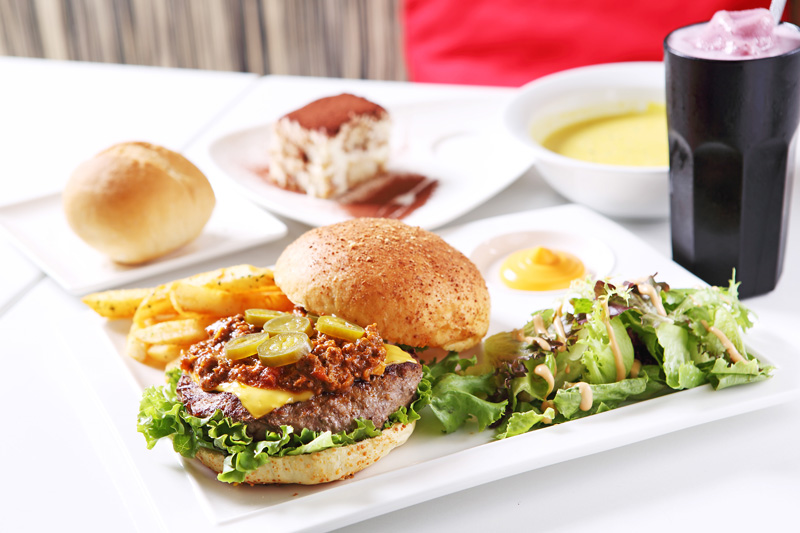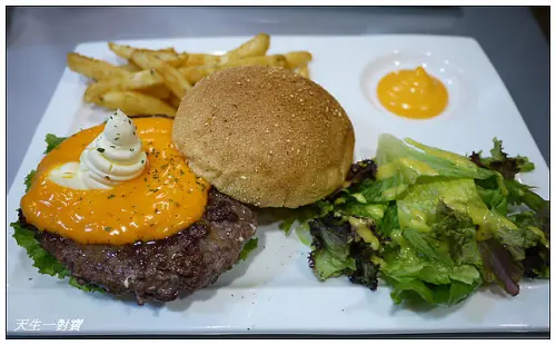 我點了一份「墨西哥辣肉醬起司牛肉堡套餐」,份量非常豐富,除了主餐漢堡外,還有麵包、濃湯、甜點、飲料,整組套餐超級澎湃而且吸睛。他們的全牛漢堡排是選用新鮮嫩肩部位,我目測推算大概可能有7盎司吧!老闆更將軟法麵包特別鋪上起司烤香,搭配上店內自製的牛肉醬、墨西哥辣椒與有機生菜,直接一口咬下相當過癮,香濃起司、鮮嫩的牛肉排及新鮮生蔬菜,多重滋味在嘴中讓我瞬間無可自拔。