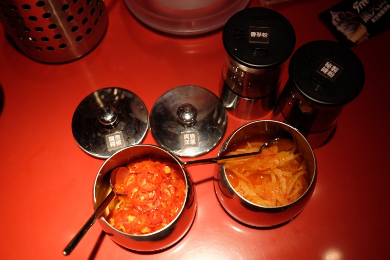桌上附有辣椒粉 香茅粉 爽脆洋蔥以及醋泡辣椒