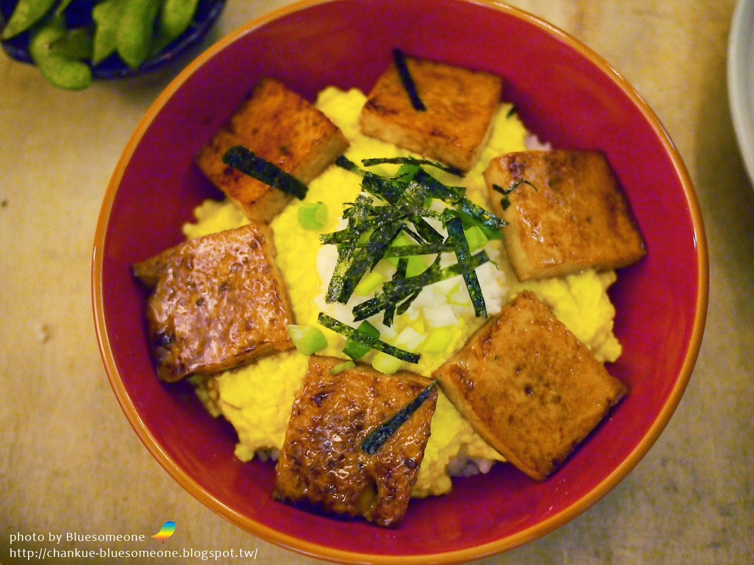 豆腐蓋飯看起來很像日式料理裡的滑蛋丼,黃澄澄的豆腐看起來超像蛋的啦!