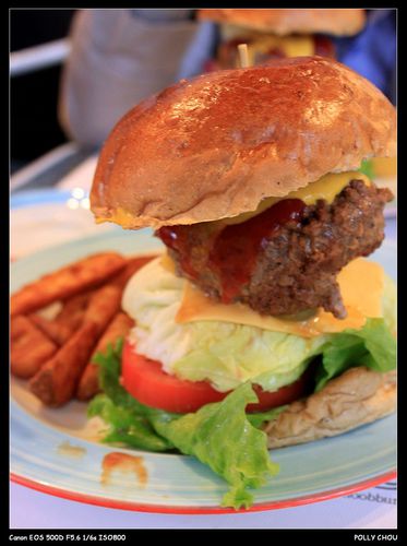 牛逼漢堡在台中似乎非常的火紅,才會在來台中玩順便排進去,要嚐嚐傳說中大口吃肉的滋味,當初就是看到菜單有趣,漢堡SIZE超大,加上人滿為患,才決定來試試,不過也沒讓我失望,肉片確實厚實多汁, 不會過於乾柴,但有點美中不足是芥茉醬和蕃茄醬量過多,導致有點蓋過牛肉原有的香味,至於麵包部份有事先烤過,香酥配著多汁的牛肉片,真是美味也很過癮,附餐的薯條也表現的不錯,加上前菜的爆米花吃到飽真的讓人覺得物超所值啊!!!用餐時間總是排滿人潮,寧可在外等也要吃大口吃漢堡啊!!!有機會來台中就試試吧!!