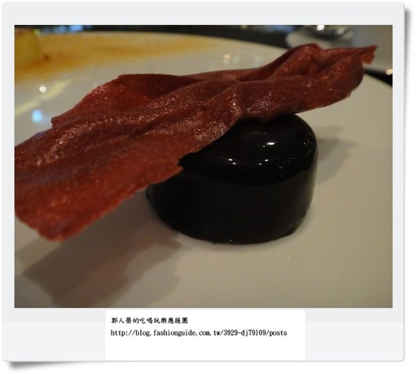 右邊的是褐紅色糖片下有塊巧克力慕斯蛋糕