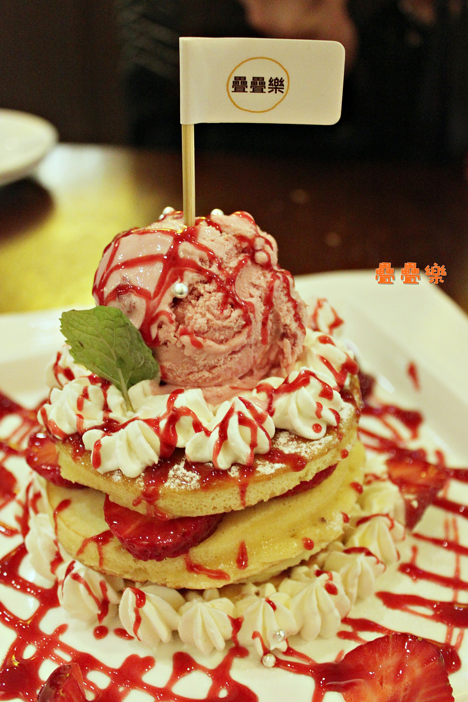 草莓冰淇淋上還有銀色小珠子 好華麗唷 厚實的三層鬆餅 配上紅吱吱的草莓 太誘人
