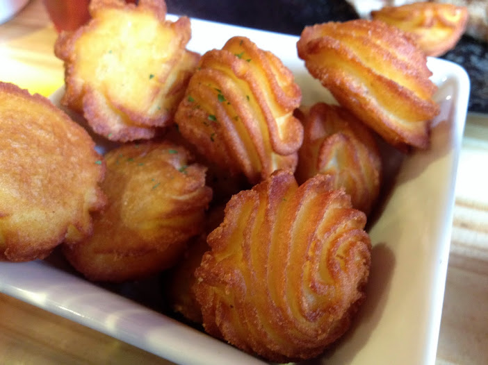 後來仔細看了一下,應該是馬鈴薯泥壓模出來(也可能是擠出來的)然後拿去油炸或者烤到金黃灑點海苔即刻上桌