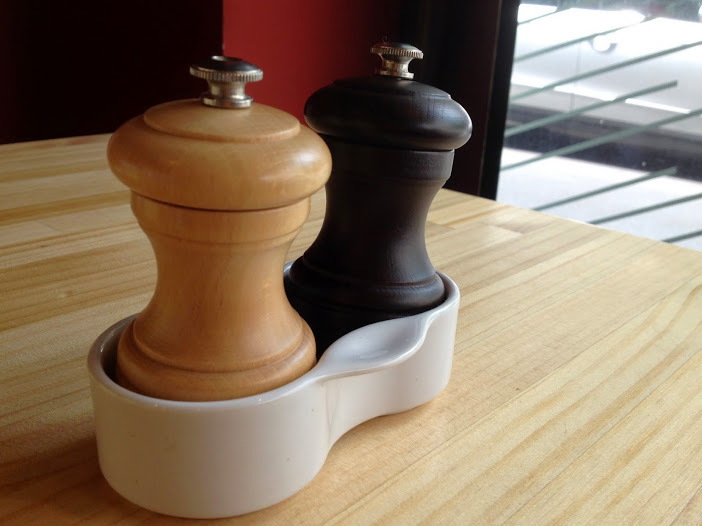 牛排上桌前一定要把玩一下調味料 左:岩鹽,右:黑胡椒顆粒