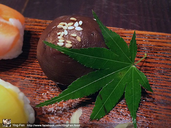 表面上的柏葉是裝飾用的,把葉子打開來,裡面的紅豆水羊羹,顏色很自然。