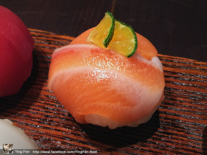 鮭魚上面加兩片小檸檬,鮭魚吃起來有酸甜的味道很特別,很有彈性跟剛剛的鮭魚一樣口感很不錯吃。