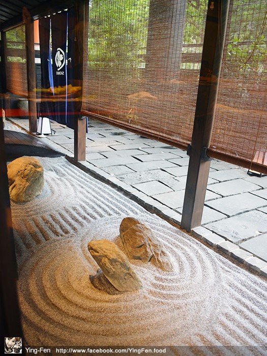 要走進大門口的台階,底下有好多細小的砂石,台階是用大塊石板堆疊起來感覺好特別,這家店的造景,石子跟砂都是來自東京,設計是由京都的庭園設計師傅指導。