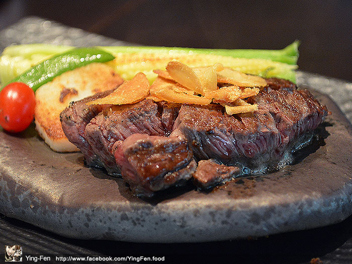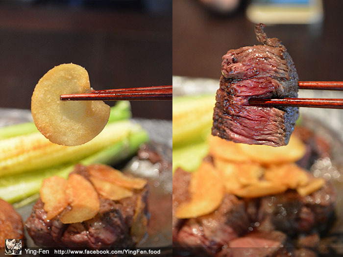 肋眼牛排上面有幾片蒜片,蒜片有處理過,外皮吃起來很酥脆,裡面的蒜片帶點半軟狀態,還蠻特別的,吃起來蒜味很濃郁非常好吃,底下的肋眼牛肉,師傅已經幫我們切好好的,牛肉塊上下有烤熟,中間有點半熟,有咖啡色和紅色漸層顏色非常漂亮。