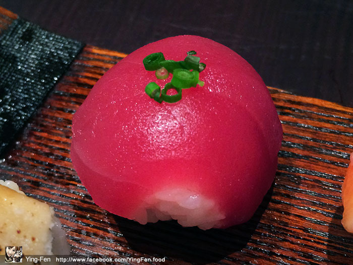 鮪魚上面加了幾個細小的蔥花,飯吃起來一球圓圓的很紮實,冰涼口感在嘴裡,吃起來蠻爽口的,