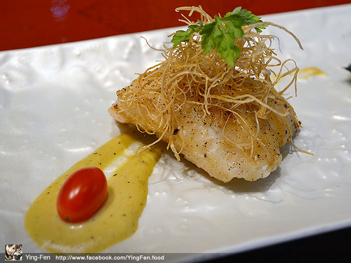 鐵板去煎出好吃的紅條魚,上面細細一絲一絲的是牛蒡,非常香酥又脆的口感,旁邊沾醬的是蛋黃加蟹味增,吃起還非常香濃的蟹膏味道帶有蛋黃香味,加上番茄一起吃做搭配。