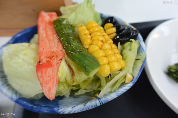 朋友點的生魚片定食,生魚片看起來很新鮮,還搭配有清爽沙拉、蝦捲、玉子燒、醃漬小黃瓜、味噌湯跟一碗酸梅飯,日式定食最大的魅力就在於乾淨整齊,看起來又很美味豐富。