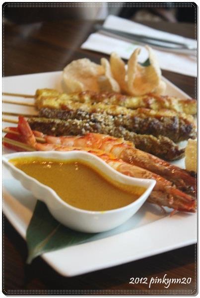 沙嗲拼盤總共有兩隻牛肉串、兩隻雞肉串、兩隻明蝦,搭配有點篇花生味的南洋風沙嗲醬