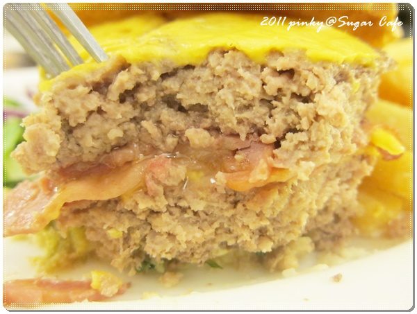 漢堡實在是大到誇張,基於部落客要保持完美的形象,我把他直接當牛排切一小口一小口慢慢吃