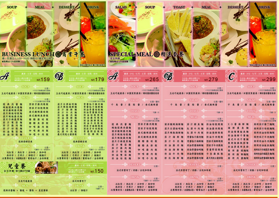 中餐(商業午餐)和晚餐(假日)都有分A、B餐 ,晚餐時段多了C餐(比較貴的主餐)