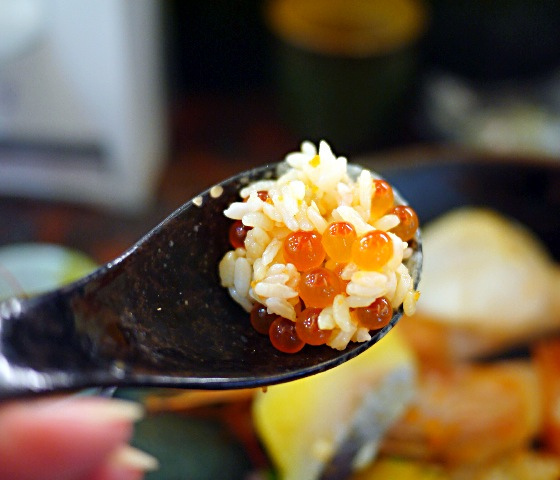 一開始claire有些吃不習慣,不過當將丼飯使用的淡醬油淋進去後,與微鹹的鮭魚卵 蝦卵一起攪拌入口