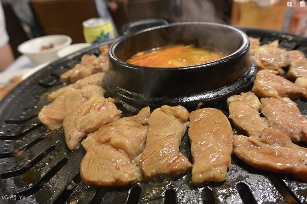 銅盤烤肉一直是我很喜歡的一道韓式料理,融合火鍋跟烤肉的概念,將醃過的牛肉放在銅盤上方加熱烤熟,外圍煮新鮮的蔬菜,肉汁順著銅盤流下湯中,讓味道更顯鮮甜,肉片不需要烤太久就可以吃,味道處理得很甜美香嫩,我喜歡~