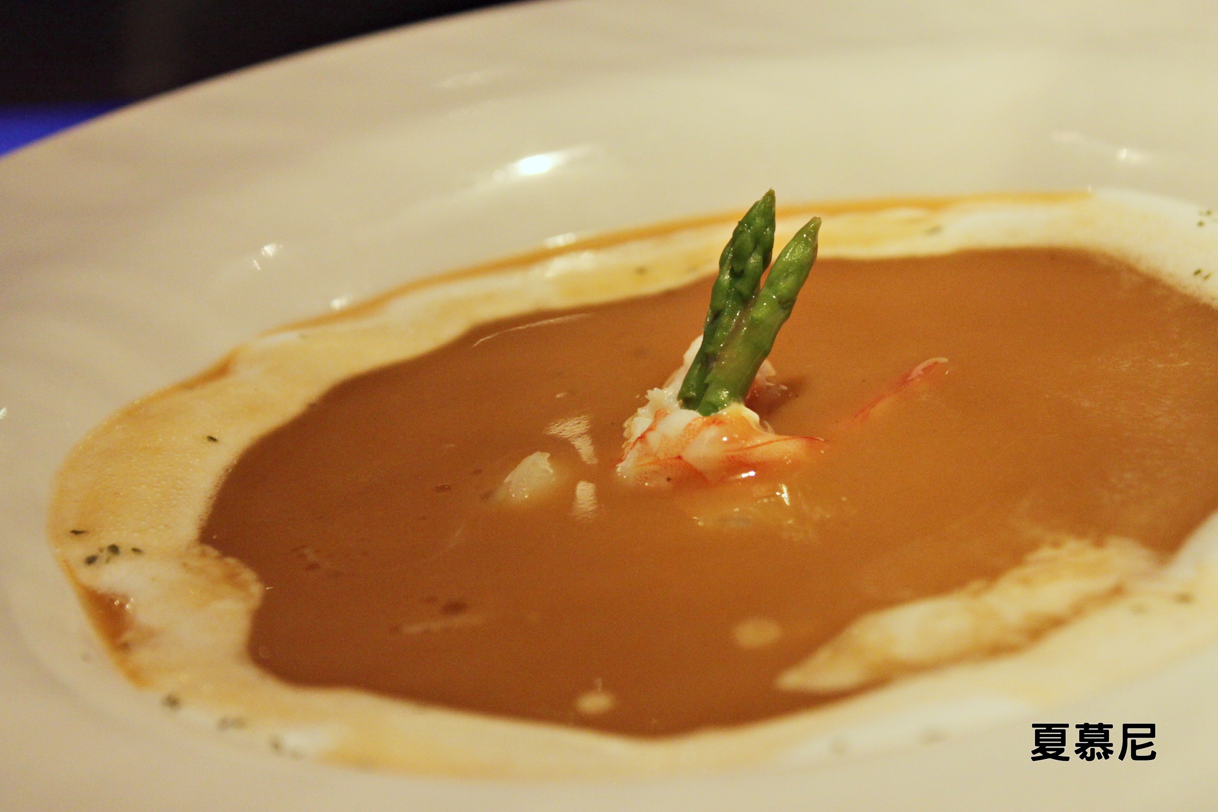 湯品登場 湯呢湯呢 服務生已經在桌邊要幫你服務囉 干貝在底層襯著蝦子和蘆筍啊