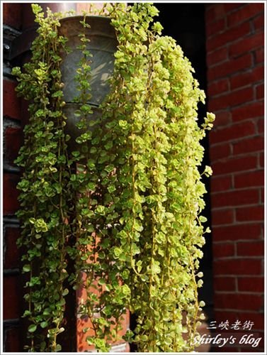 紅磚牆柱上的盆栽,紅配綠,古色中的綠意,象徵生生不息。