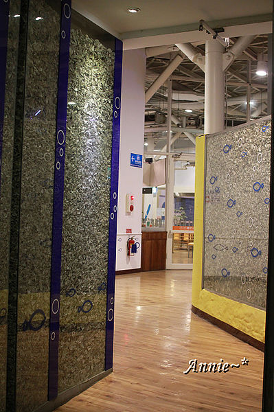 美食街裝潢用不同色調的藍色馬賽克貼磚貫徹海洋風,