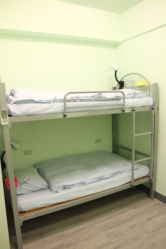途中是典型的青年旅舍,提供8人房、6人房,有男女混住也有女生宿舍。這次與友人訂的房間則是兩人房,只有一張上下舖的床位,房間倒是空曠,只有一張桌子和保險箱與衣架,簡單乾淨,床單與被套已經套好了,離開時要自己把床單被套取下丟入外頭的洗衣籃,方便旅館更換清洗。