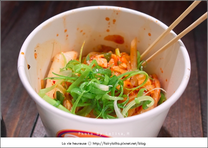 小小一盒,裡面年糕份量並不多,價格還真是不便宜,除了泡菜,另外也加了青蔥點綴。