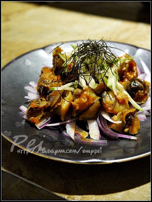 辣味螺肉(100元) Q韌的螺肉比熱炒店的「龍珠」還要有咬勁! 脆口彈牙 搭配些許嗆辣的洋蔥和清爽的小黃瓜 實在開胃!(螺肉本身有一點點辣度)
