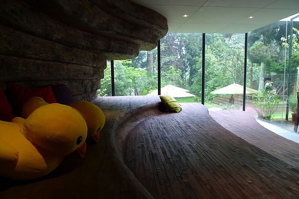 這木板休憩區可是要脫鞋才能上去喔。兩隻黃色小鴨鎮守其中,木頭散發出的天然香氣,在這自成一格的空間釋放減壓。